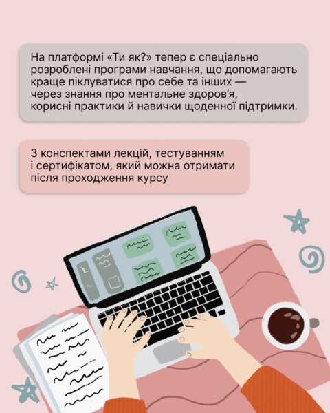 13 травня 2025Якби існувала школа, де вчать стійкості, турбуватися про себе та інших… то вона була би в межах освітньої платформи «Ти як?». На сайті вже є перші 4 курси для тих, хто хоче підтримати себе та своїх близьких