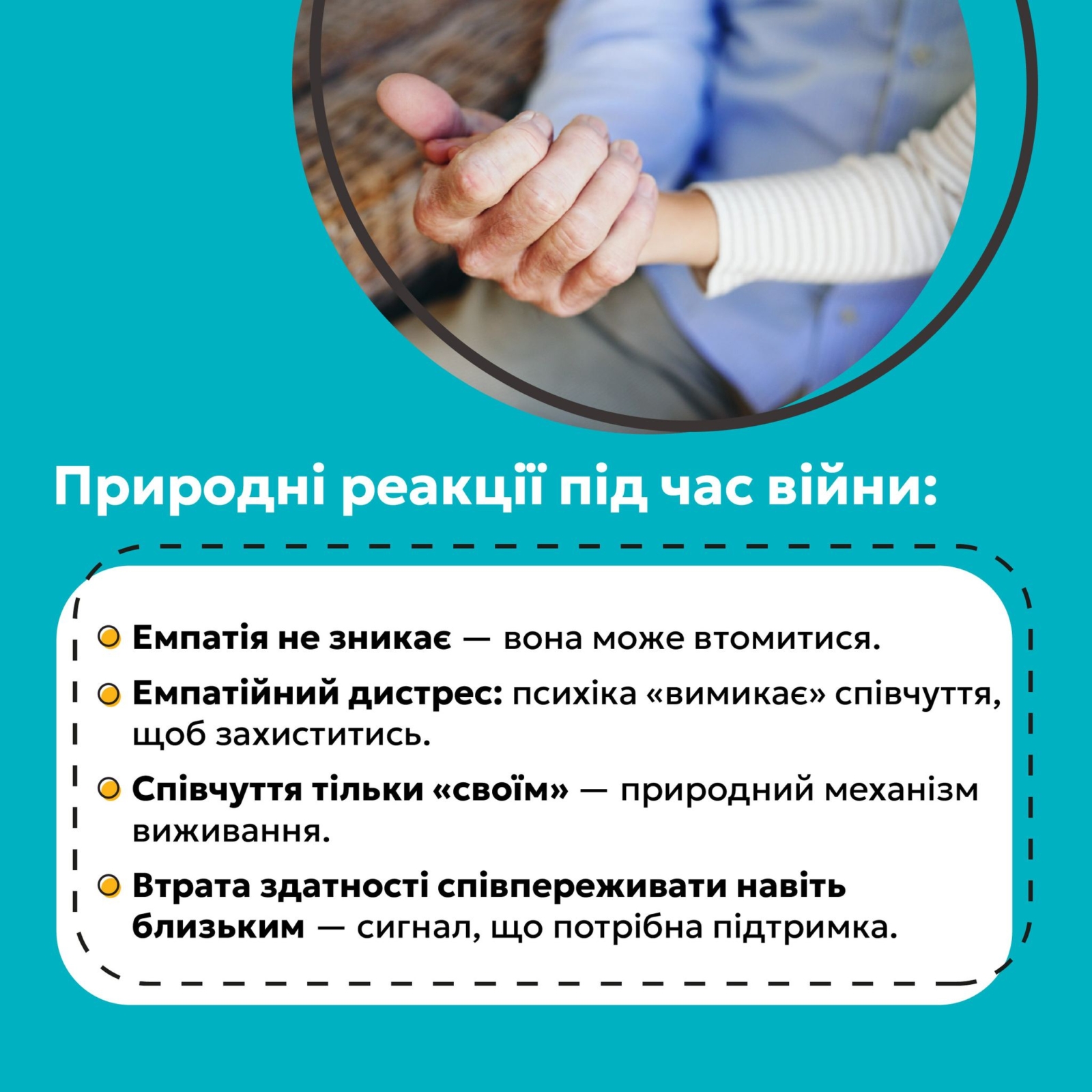 Під час війни у дітей (і дорослих) емпатія може притуплюватись. Це не байдужість – це природний захисний механізм психіки. Коли ми перевантажені болем, можемо «відключати» співчуття, щоб зберегти себе – це називається емпатійний дистрес.
