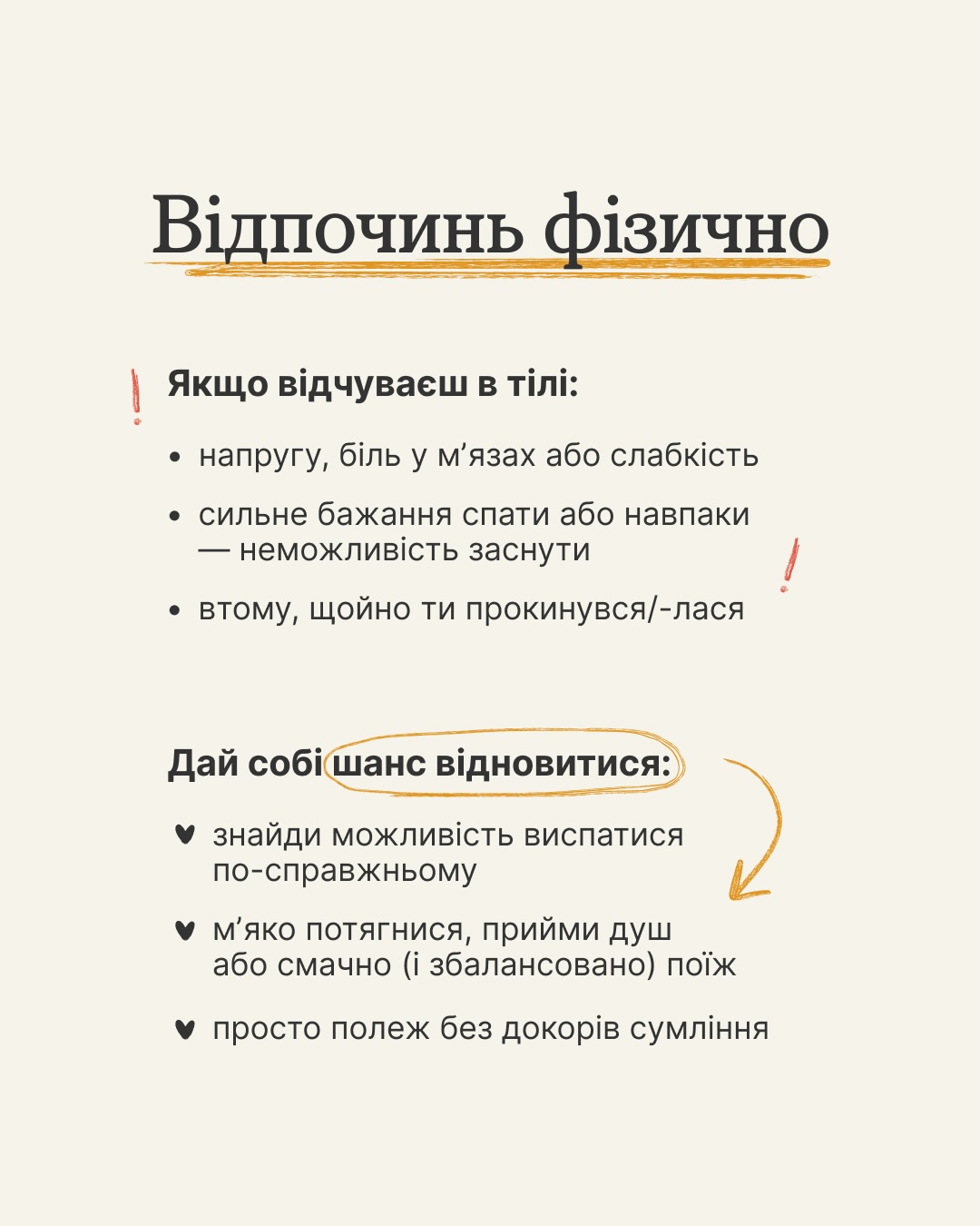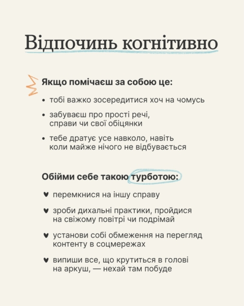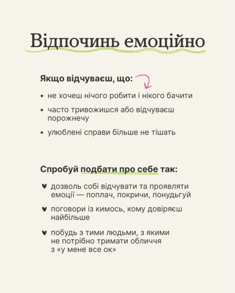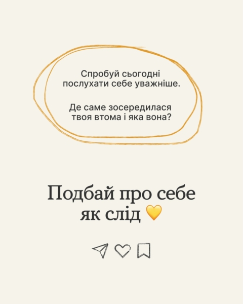У каруселі знайдеш три типи втоми й прості способи, як відновитися по-справжньому. Комбінуй їх, якщо потрібно, і не забувай дбати про себе. Домовились? 👀