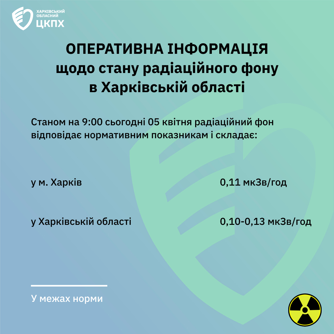 За даними моніторингових досліджень протягом дня 4 квітня рівні зовнішнього гамма-випромінювання не перевищували значень природного радіаційного фону, характерного для території Харківської області (0,3 мкЗв/год), й складали у м. Харків 0,10-0,12 мкЗв/год та Харківській області 0,10-0,17 мкЗв/год.