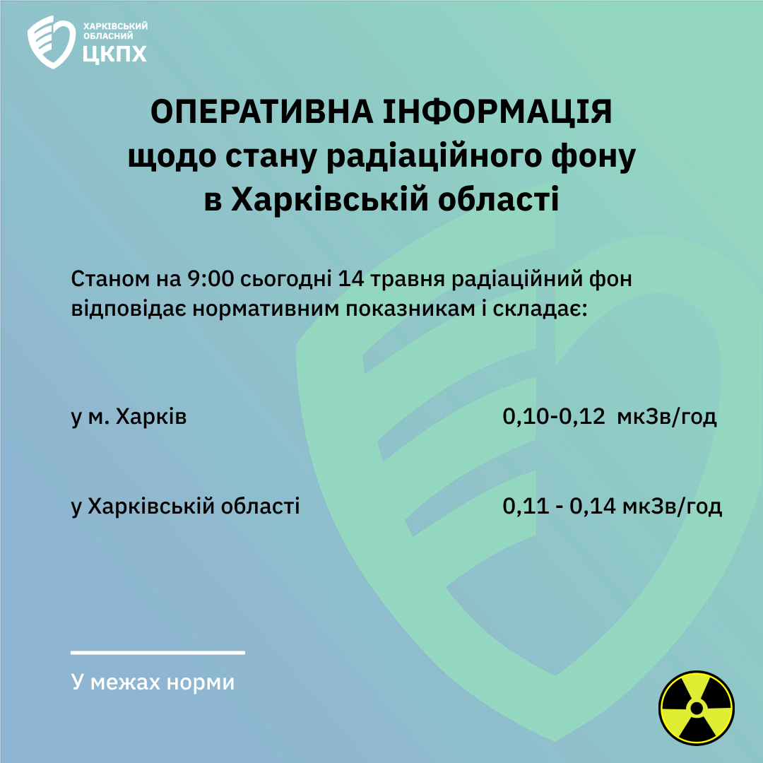 За даними моніторингових досліджень протягом дня 13 травня рівні зовнішнього гамма-випромінювання не перевищували значень природного радіаційного фону, характерного для території Харківської області (0,3 мкЗв/год), й складали у м. Харків 0,10-0,13 мкЗв/год та Харківській області 0,10-0,14 мкЗв/год.