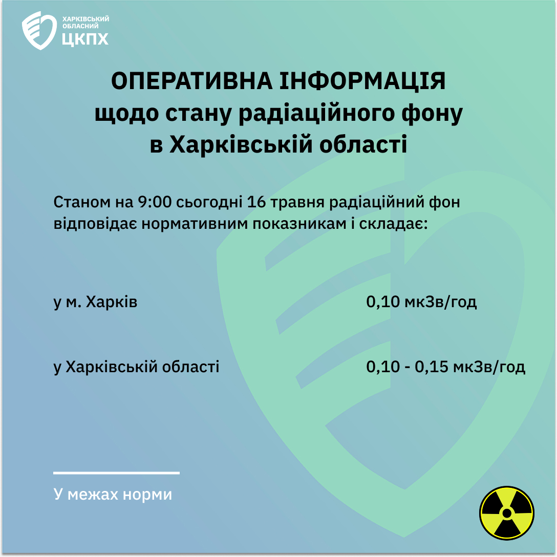За даними моніторингових досліджень протягом дня 15 травня рівні зовнішнього гамма-випромінювання не перевищували значень природного радіаційного фону, характерного для території Харківської області (0,3 мкЗв/год), й складали у м. Харків 0,10-0,13 мкЗв/год та Харківській області 0,10-0,14 мкЗв/год.
