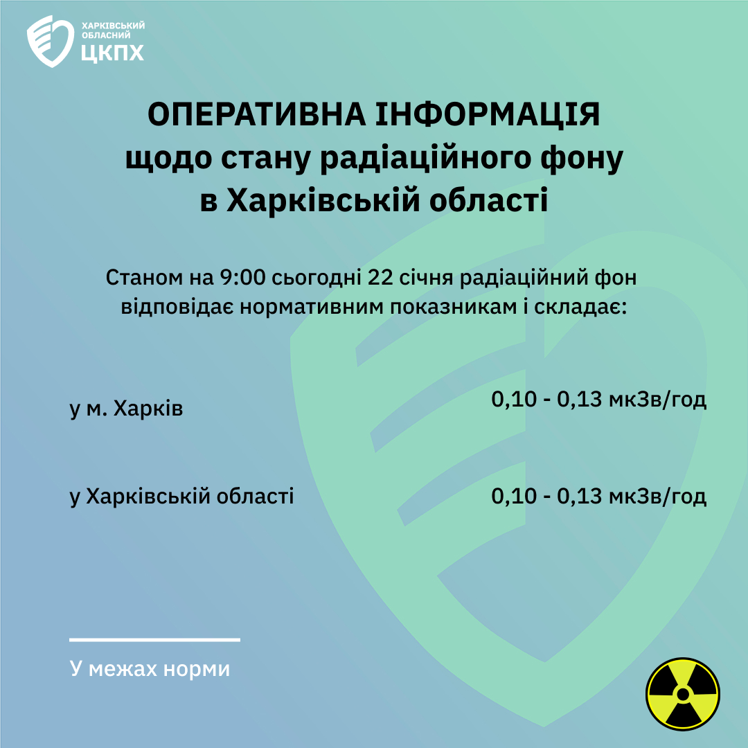 За даними моніторингових досліджень протягом дня 21 січня рівні зовнішнього гамма-випромінювання не перевищували значень природного радіаційного фону, характерного для території Харківської області (0,3 мкЗв/год), й складали у м. Харків 0,10-0,13 мкЗв/год та Харківській області 0,10-0,16 мкЗв/год.