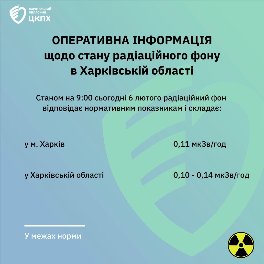 За даними моніторингових досліджень протягом дня 5 лютого рівні зовнішнього гамма-випромінювання не перевищували значень природного радіаційного фону, характерного для території Харківської області (0,3 мкЗв/год), й складали у м. Харків 0,10-0.15 мкЗв/год та Харківській області 0,10-0,16 мкЗв/год.