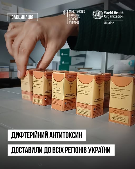 Україна отримала 249 ампул дифтерійного антитоксину в рамках співпраці Міністерства охорони здоров’я України та Всесвітньої організації охорони здоров’я. Дифтерійний антитоксин доставили до всіх регіонів. Він має критичне значення для запобігання небезпечним для життя ураженням верхніх дихальних шляхів, серцевої та нервової систем під час лікування.