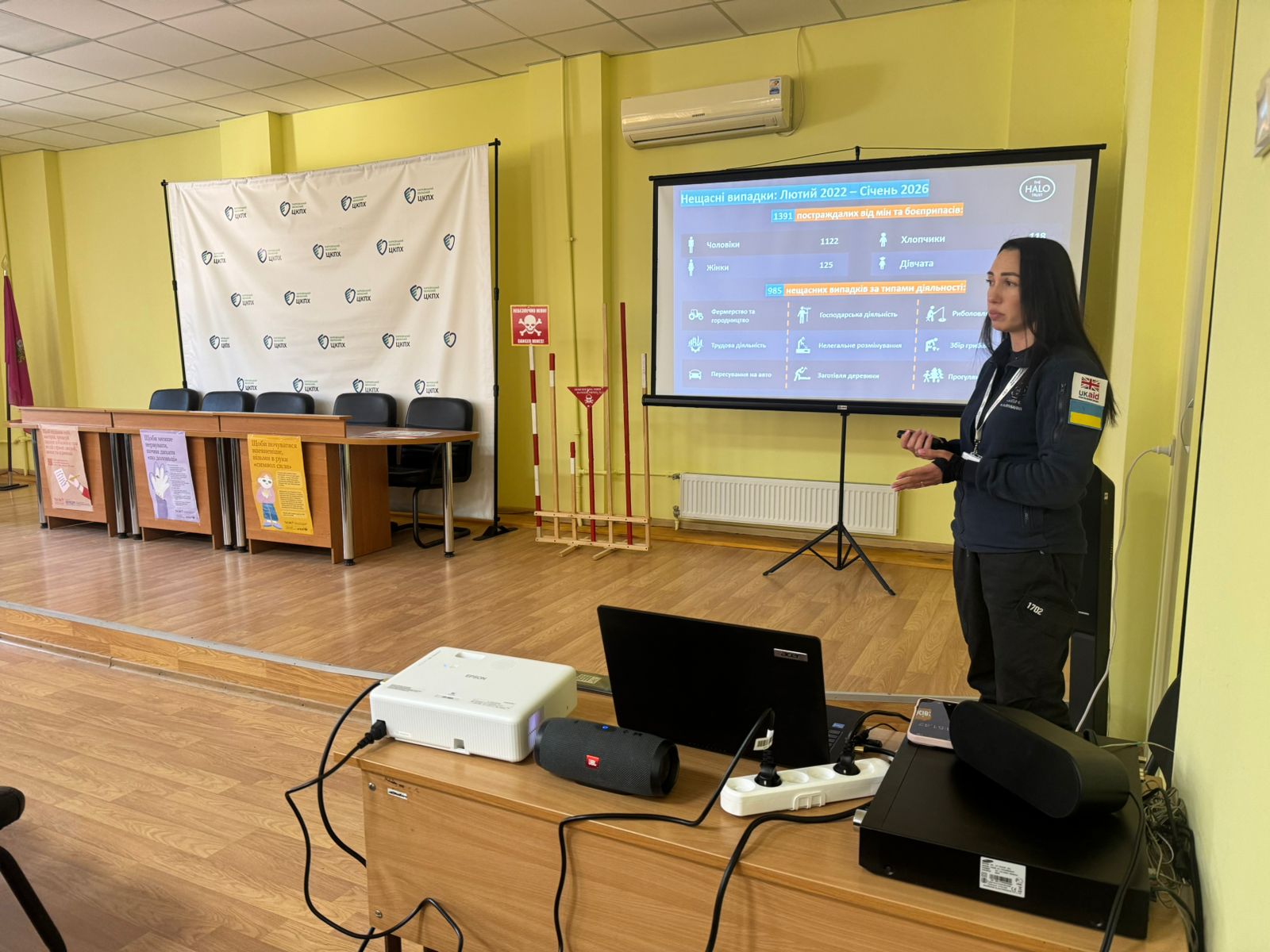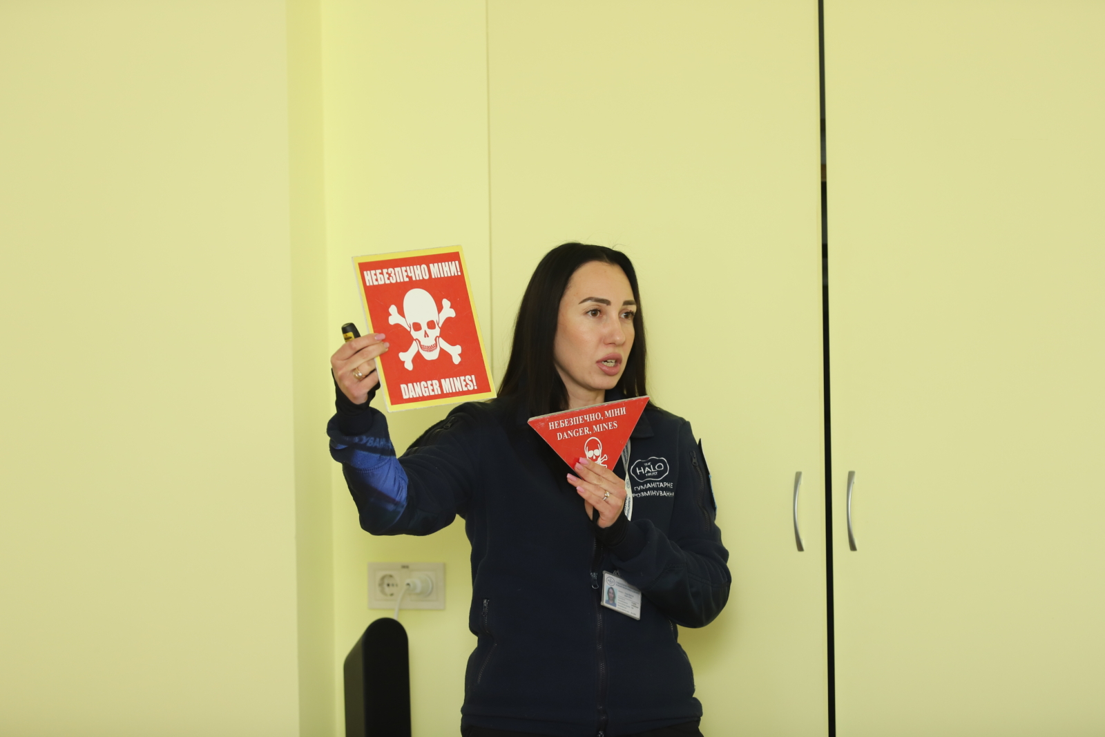 Під час заходу у форматі презентації представники HALO Trust надали інформацію про найпоширеніші в Україні вибухонебезпечні предмети, правила безпечної поведінки у разі їх виявлення, ознаки й маркування небезпечних територій, а також порядок дій у разі потрапляння на потенційно небезпечну ділянку.