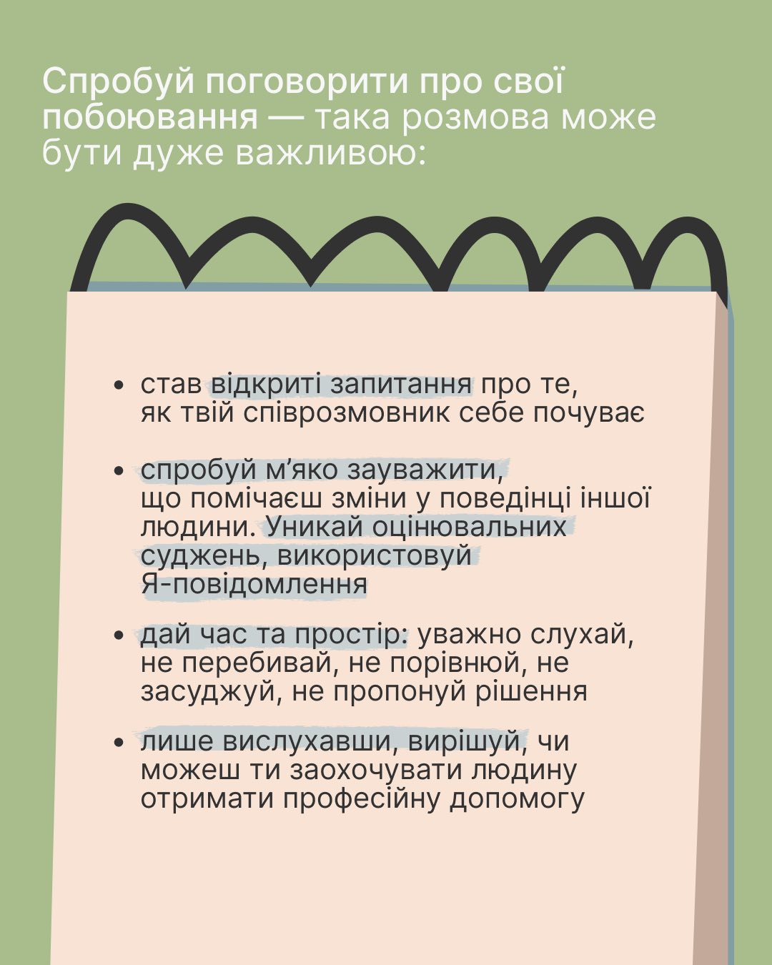 Найперше старайся не давати рекомендацій, не казати нічого на кшталт «візьми себе в руки».
