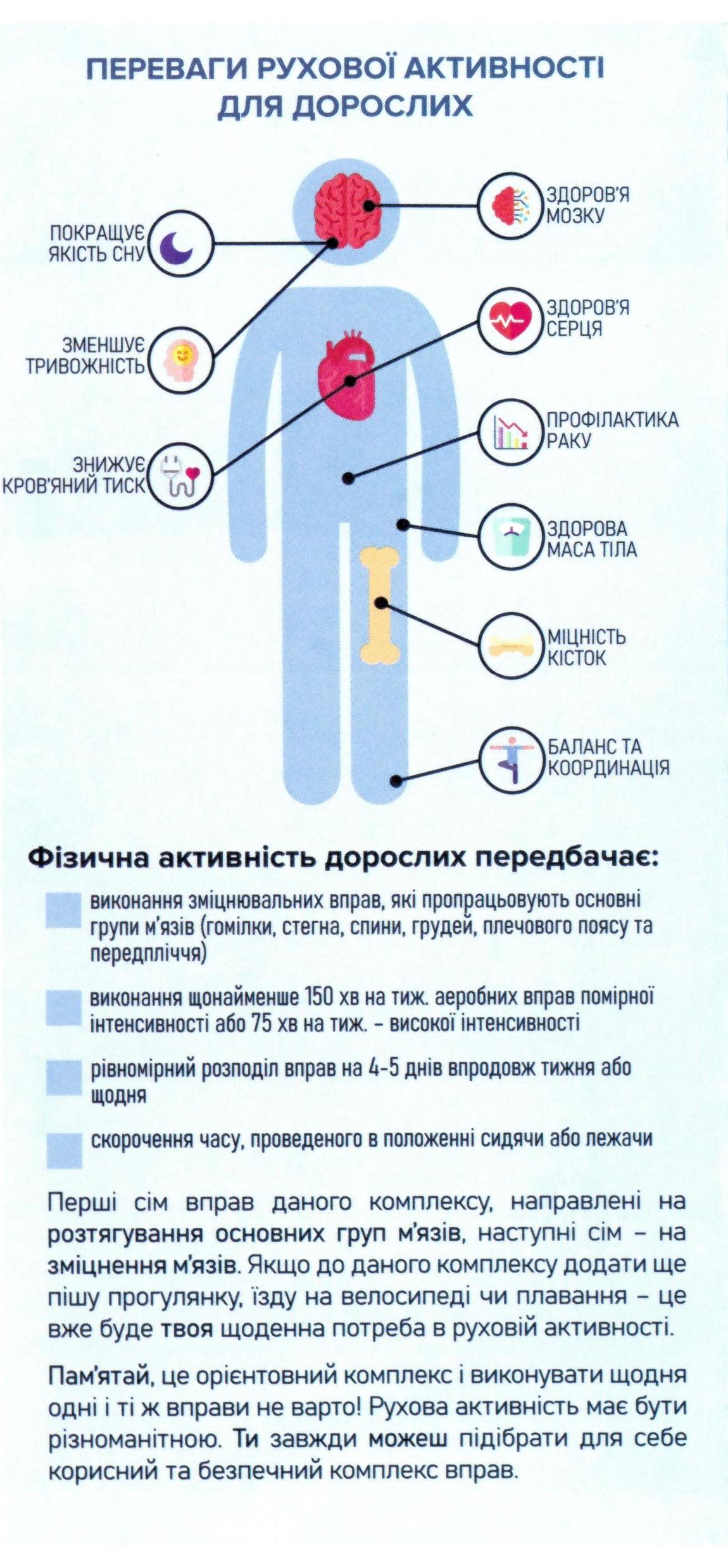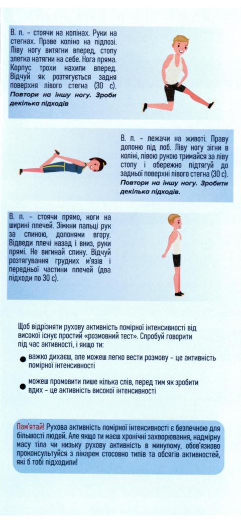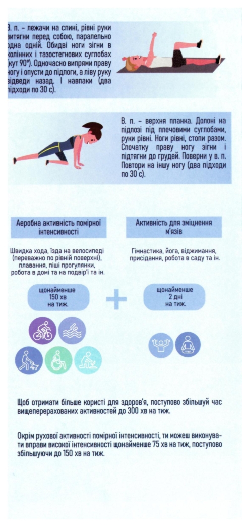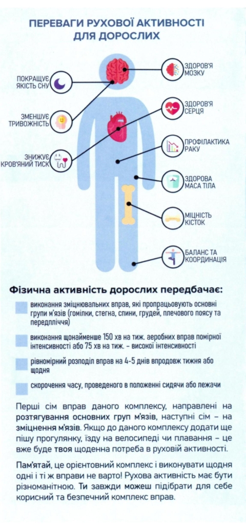 Нашим читачам нагадуємо, що рухова активність помірної інтенсивності є безпечною для більшості людей. Але якщо ви маєте хронічні захворювання, надмірну масу тіла чи низьку рухову активність в минулому, обов’язково проконсультуйтесь з лікарем стосовно типів та обсягів активностей, які б вам підходили!