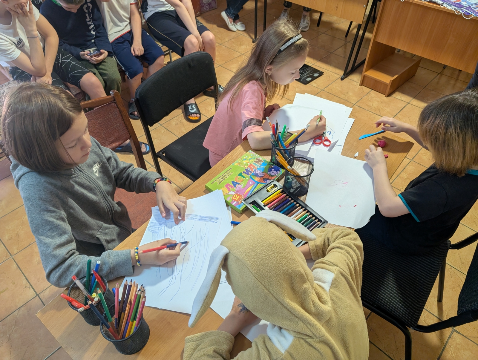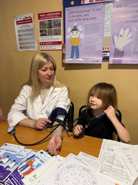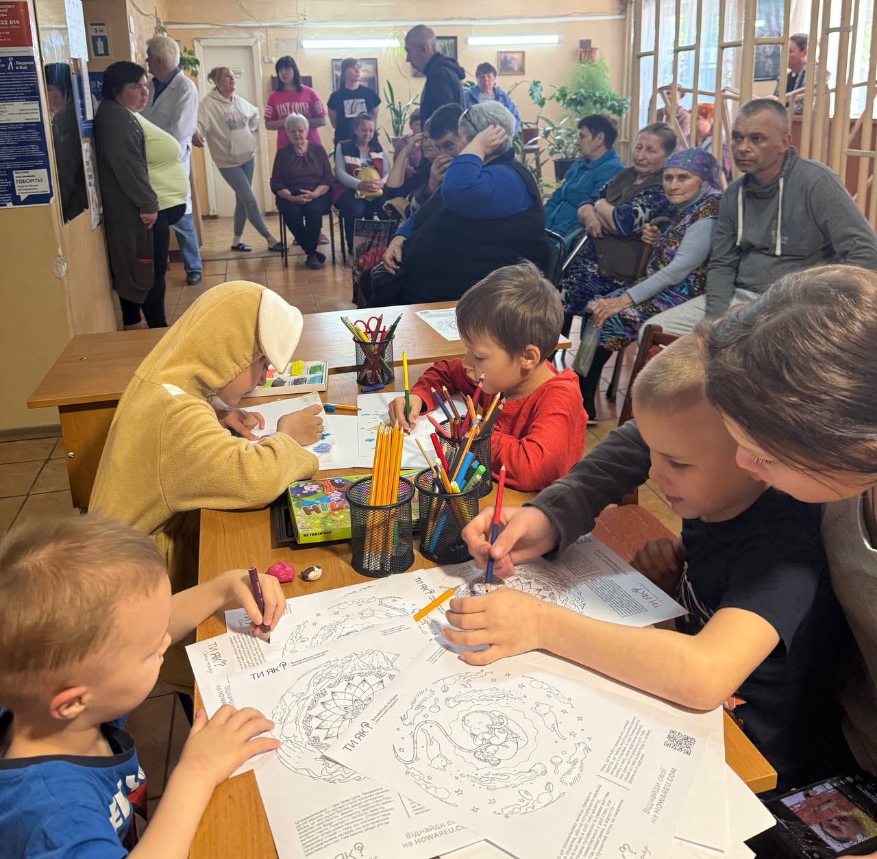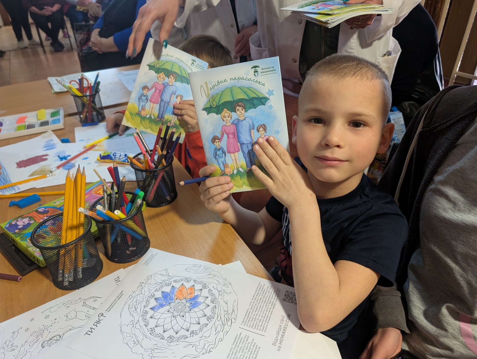 Усім, хто щепився подарували м’ятний чай. Для дітей, які мешкають у гуртожитку організували дитячий куточок. Малеча із задоволенням розфарбовувала малюнки з тематикою ментального здоров’я: «Ти як? Світи всередині», створювала саморобки з пластиліну та пригощалася корисними смаколиками.
