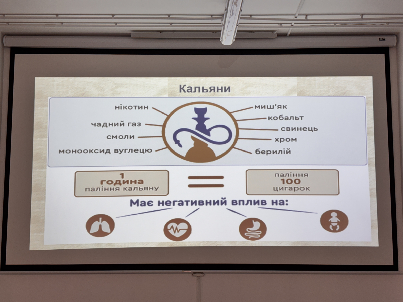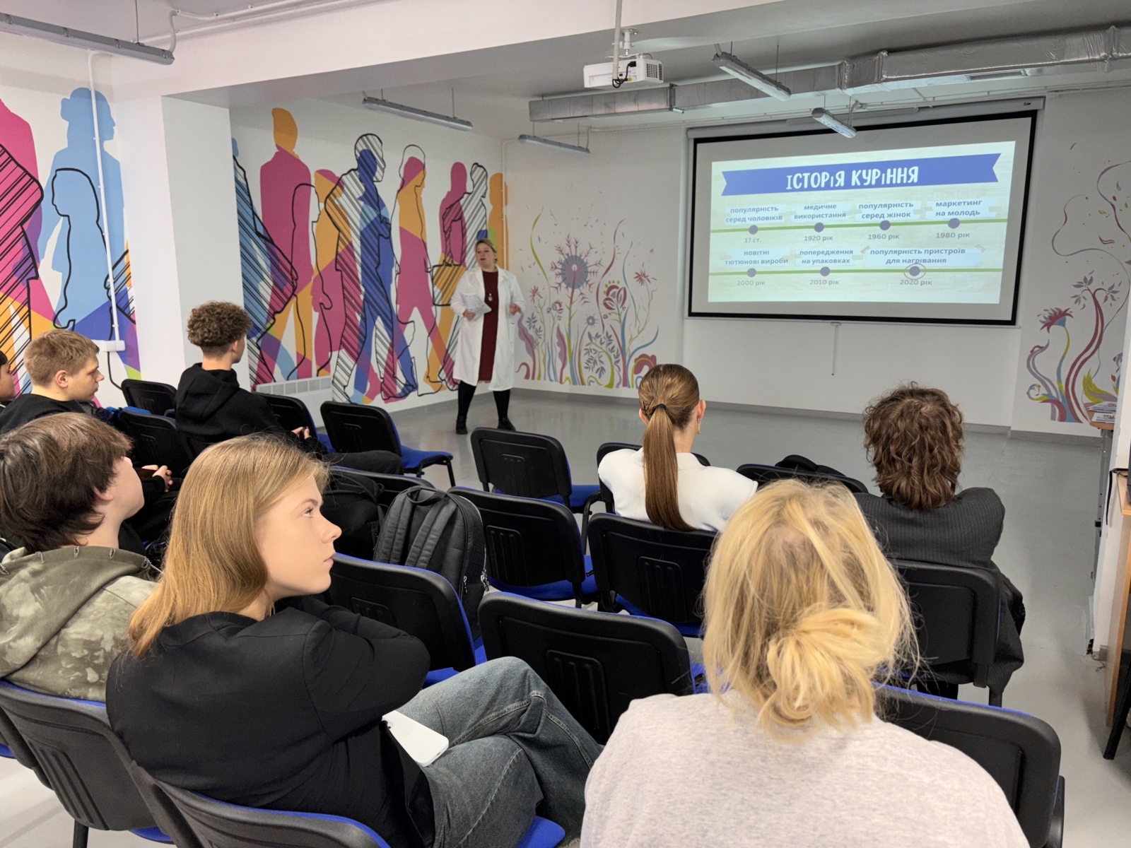 На лекції детально розглянули всі сучасні різновиди тютюну, сигарет та маркетингові міфи, які активно поширюються серед підлітків. Окрему увагу фахівці приділили небезпеці електронних сигарет, вживання снюсів та нікотинових паучів, які часто позиціонуються як «безпечна» альтернатива, пояснили, як саме маркетингові кампанії використовують міфи про нібито їх «меншу шкоду».