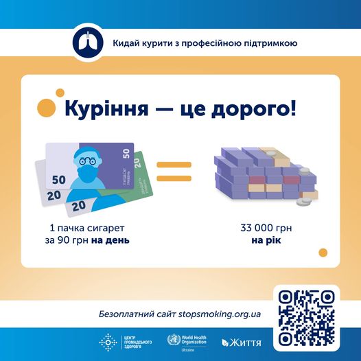 Переходь на stopsmoking.org.ua та кидай курити з безоплатною професійною підтримкою. А за допомогою простого калькулятора за посиланням stopsmoking.org.ua/section/finansovi-perevagi тобі вдасться розрахувати кількість втрачених та збережених коштів і років життя.