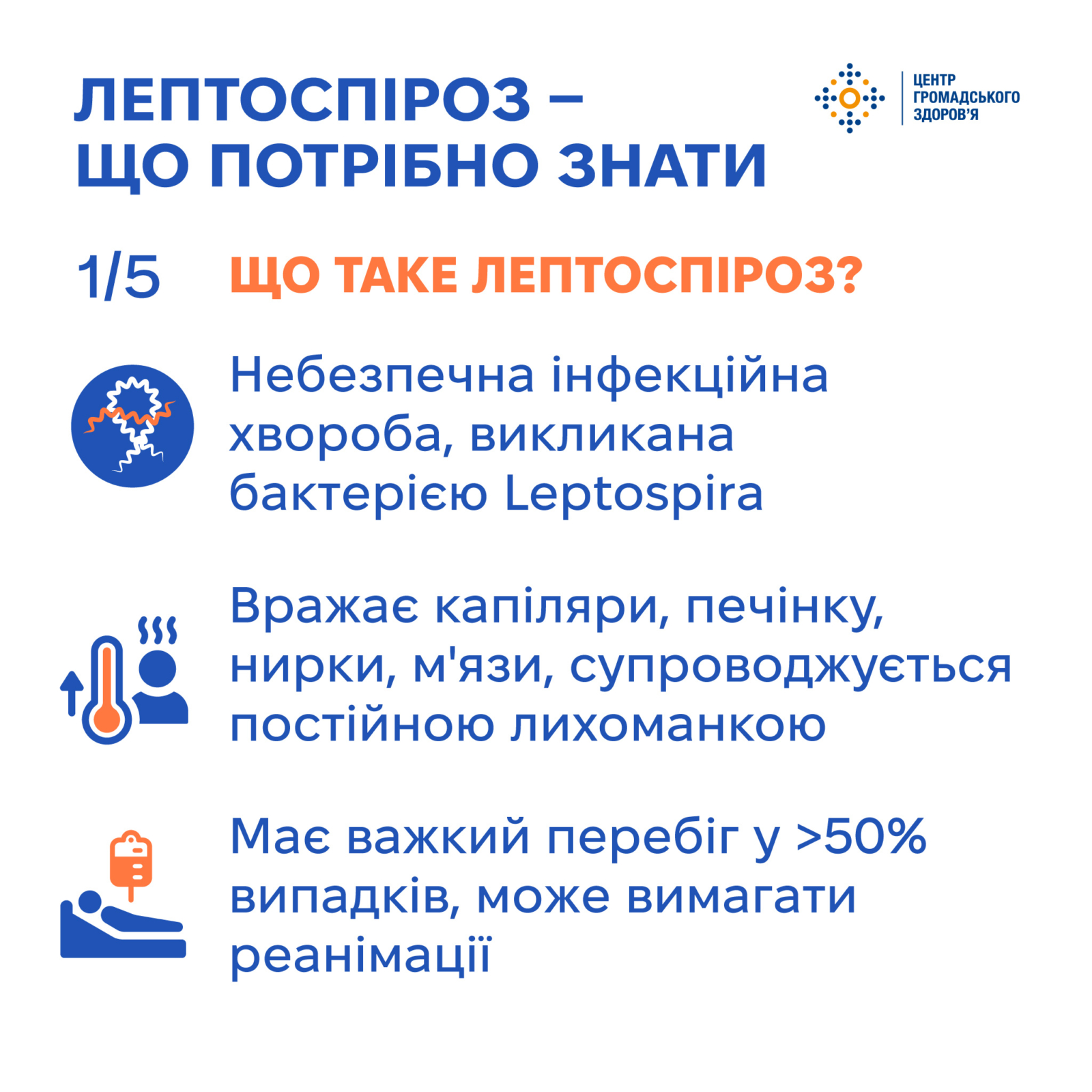 7 жовтня 2024Лептоспіроз — це небезпечна інфекційна хвороба, викликана бактерією роду Leptospira. Її особливість у тому, що вона пошкоджує кровоносні судини (капіляри) організму та може призвести до ураження печінки, нирок, м’язів, та супроводжується тривалою лихоманкою.