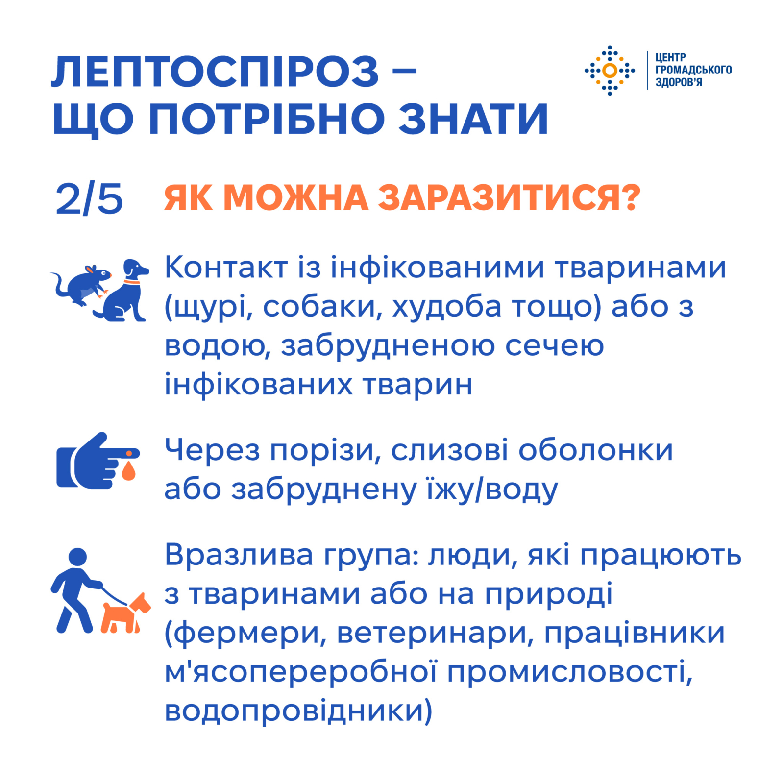 Лептоспіроз передається через укус гризуна, травмовану шкіру (порізи), слизові оболонки або під час споживання забруднених сечею інфікованих тварин їжі (молоко, м’ясо) чи води, купання, риболовлі, догляду за хворими тваринами.