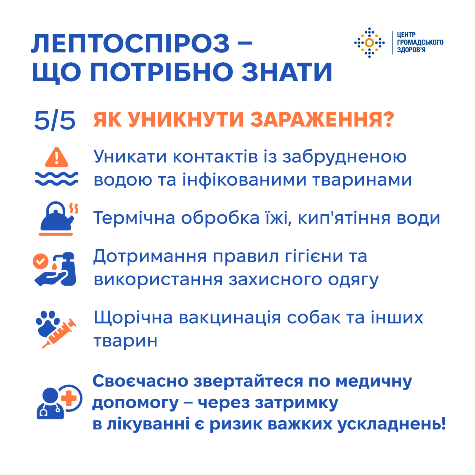 Лептоспіроз — це небезпечна інфекційна хвороба, яка потребує уваги та своєчасного лікування. Основний шлях запобігання — уникати контактів з інфікованими тваринами та водою, а також дотримуватися правил гігієни.