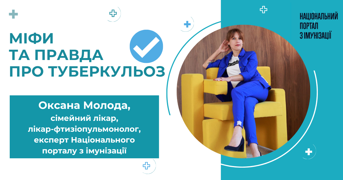 Попри те, що туберкульоз в наш час є повністю виліковним, упередження та міфи навколо нього заважають багатьом хворим вчасно отримати необхідну медичну допомогу та одужати. Найрозповсюдженіші міфи про туберкульоз розвінчує Оксана Молода – лікар-фтизіопульмонолог, позаштатний експерт НСЗУ з питань профілактики та лікування туберкульозу, експерт Національного порталу з імунізації.