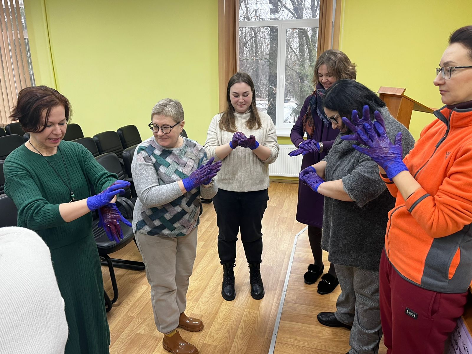 Також в процесі навчання відпрацювали навички з гігієни рук за допомогою практичних завдань, покращили вміння надягання та знімання медичних рукавичок. Для перевірки якості обробки рук використовувався УФО-бокс.