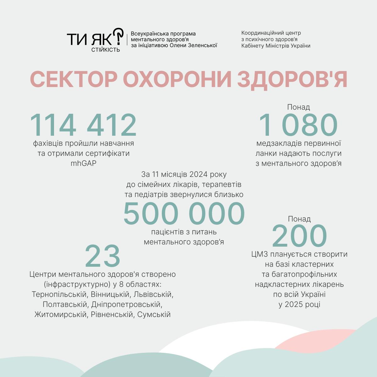 👩⚕️ Сімейні лікарі, терапевти, педіатри. Попри пов’язані з війною виклики 114 тисяч фахівців пройшли навчання з ментальної допомоги. І отримали вже маже 500 тисяч звернень (найчастіші скарги пацієнтів – відчуття тривоги, напруженості, проблеми зі сном).