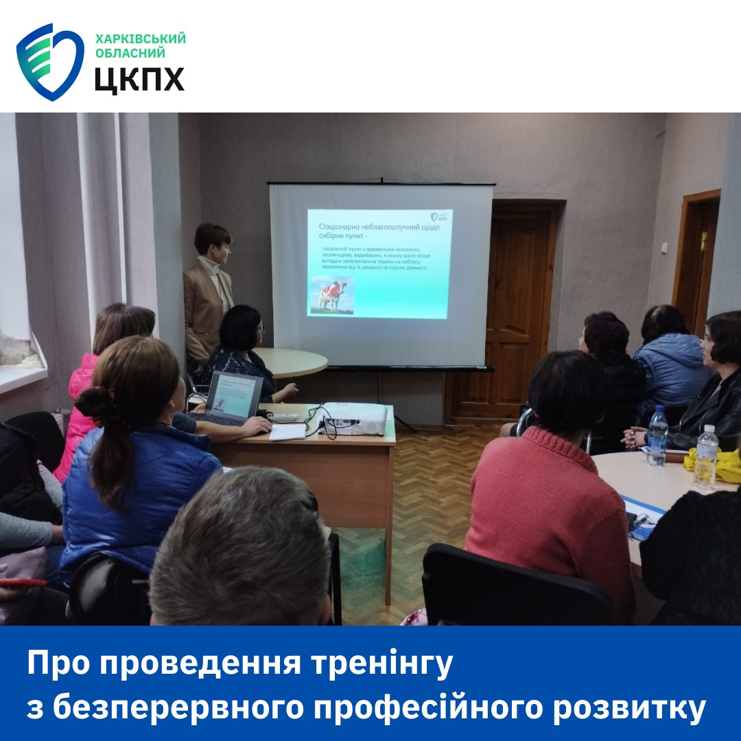 На базі ДУ «Харківський ОЦКПХ МОЗ» 26.04.2022 в офлайн-форматі проведений тренінг з безперервного професійного розвитку на тему: «Сибірка. Актуальність в умовах військових дій». Спікерами заходу виступили завідувач відділення особливо небезпечних інфекцій ДУ «Харківський ОЦКПХ МОЗ» Ганна Сухорукова, лікар-епідеміолог відділення особливо небезпечних інфекцій Олена Кондратенко, завідувач лабораторії особливо небезпечних інфекцій Людмила Килипко.