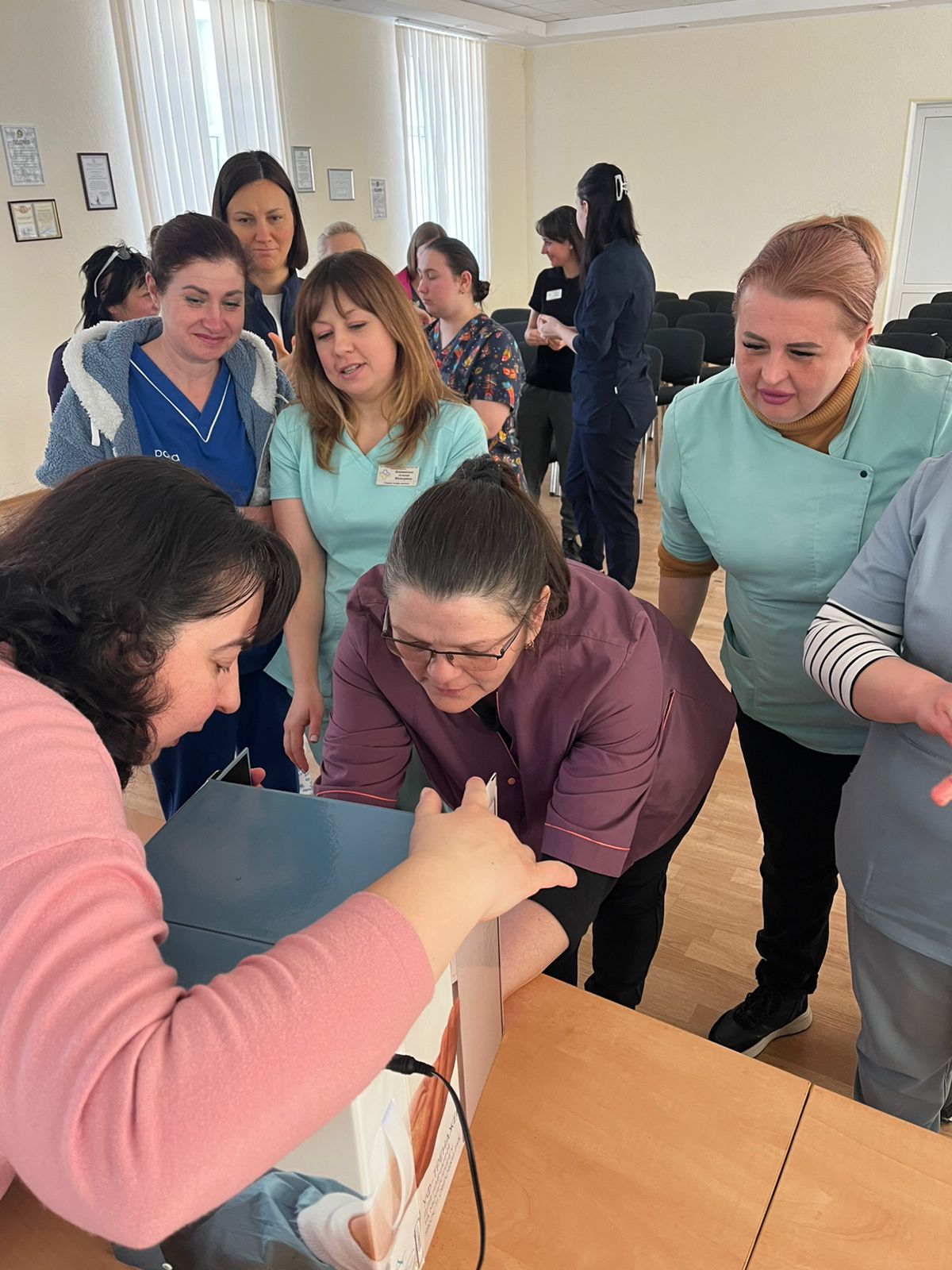 Також в процесі навчання відпрацювали навички з гігієни рук за допомогою практичних завдань, покращили вміння надягання та знімання медичних рукавичок. Для перевірки якості обробки рук використовувався УФО-бокс.