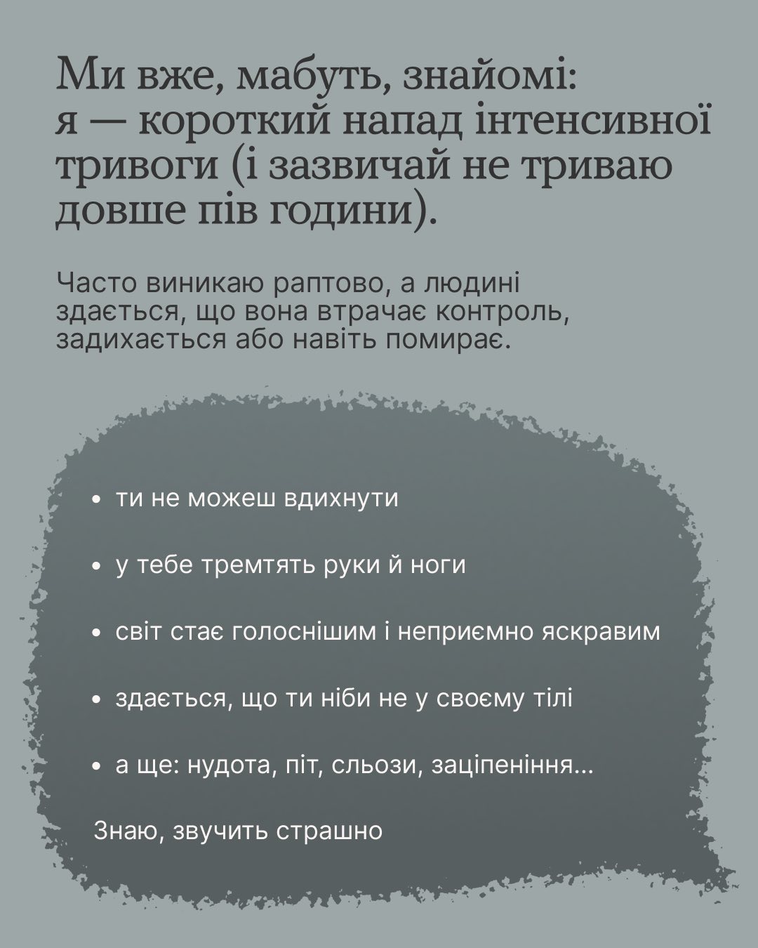 10 липня 2025Знайомся, це — панічна атака, і вона говорить сама за себе