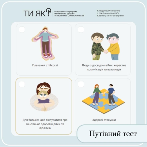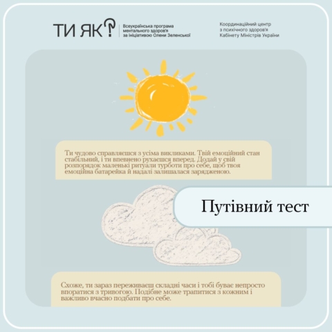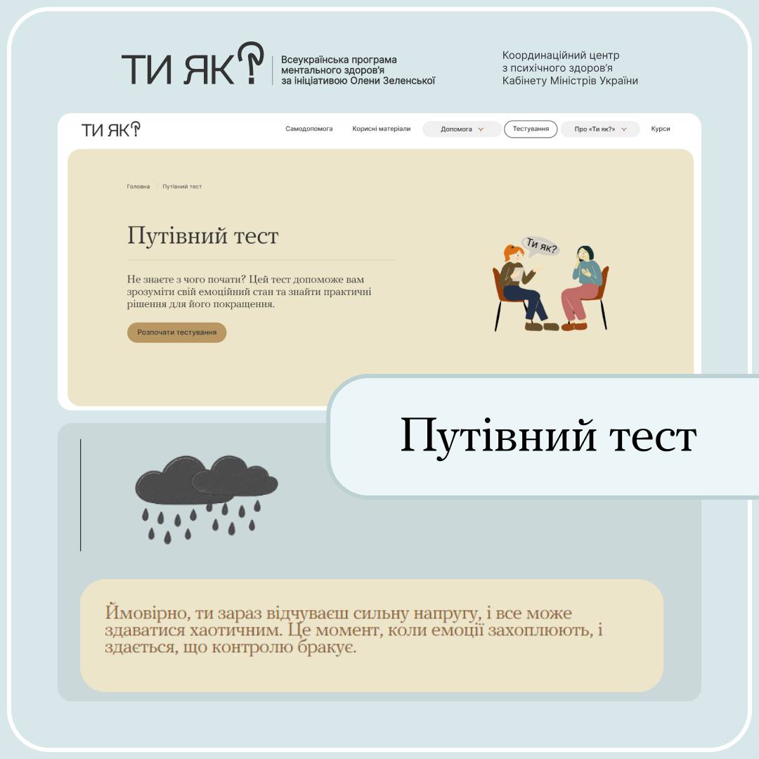 Навіть одне «так», навіть одне «можливо» та навіть одне «не впевнений / не впевнена» – привід пройти Путівний тест на платформі Всеукраїнської програми ментального здоров’я Ти як? – ініціативи першої леді Олена Зеленська. Це саме той інструмент, коли ви не знаєте з чого почати, аби зрозуміти свій психоемоційний стан, та знайти практичні рішення для його покращення.