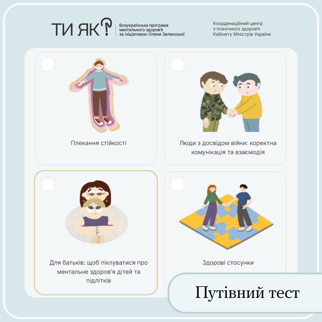 Пройти Путівний тест можна на платформі «Ти як?» за посиланням: https://howareu.com/tests/putivnyi-test