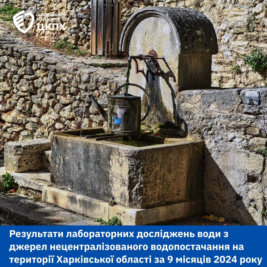 За 9 місяців 2024 року у Харківській області за санітарно-хімічними показниками досліджено 1439 проб води з джерел нецентралізованого водопостачання (колодязі та каптажі джерел), з яких 54,9% не відповідали вимогам ДСанПіН 2.2.4-171-10 «Гігієнічні вимоги до води питної, призначеної для споживання людиною».