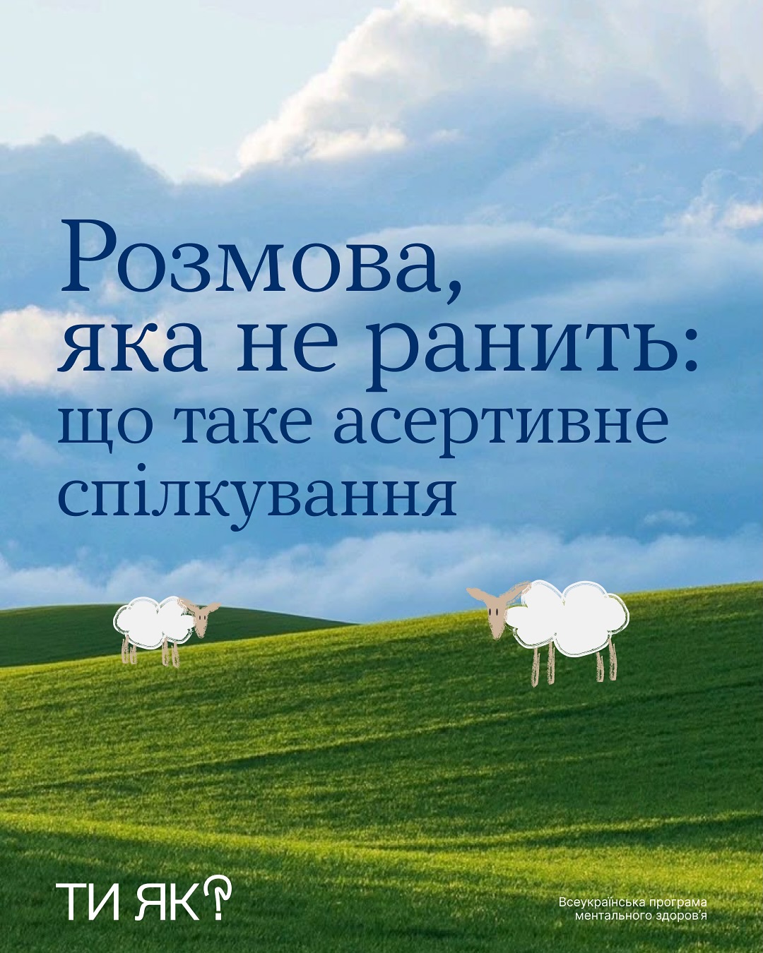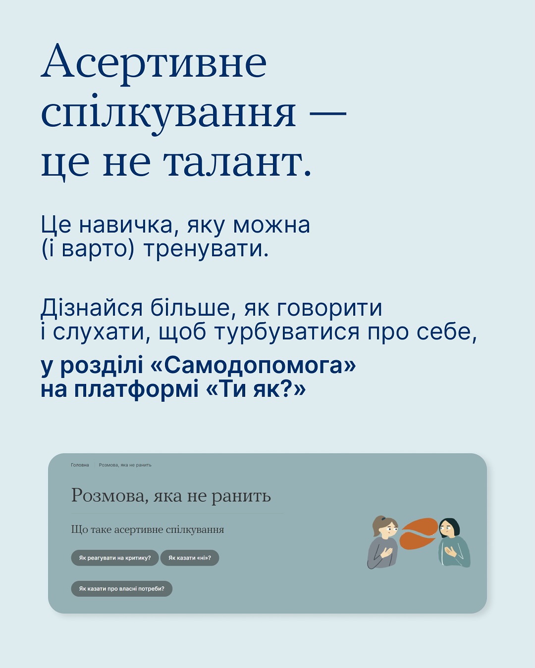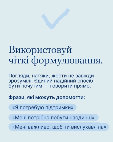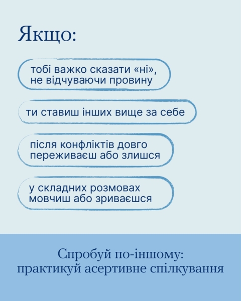 Дізнайся в каруселі, що таке асертивне спілкування. Та переходь у розділ «Самодопомога» на платформі «Ти як?», щоб прочитати більше.