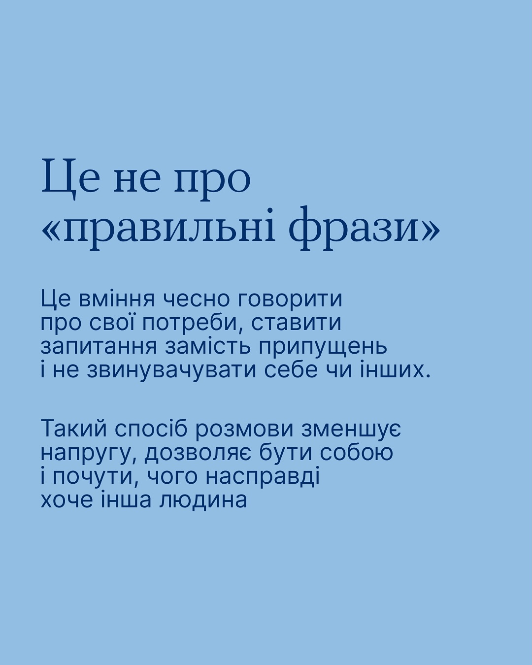 Здатність пояснювати свої потреби та перевіряти припущення, не звинувачуючи себе чи інших, зменшує напругу й допомагає краще розуміти одне одного 🤝