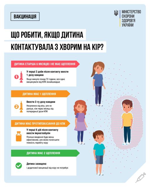 Якщо дитина віком від 6 місяців до 12 місяців контактувала з хворим на кір, їй необхідно якнайшвидше – бажано протягом 72 годин – ввести одну дозу вакцини КПК.