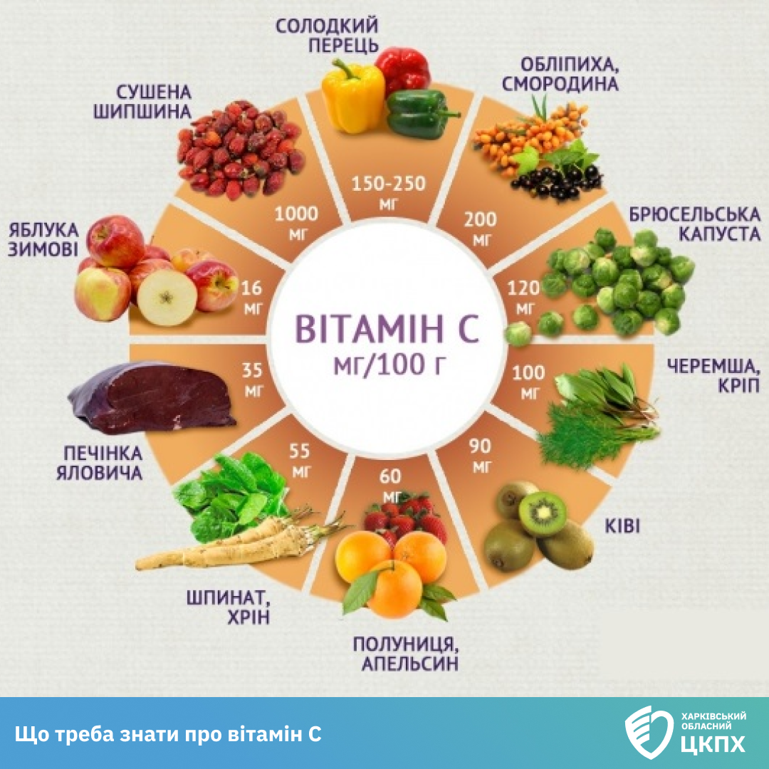 - Найбільше вітаміну С міститься в овочах, фруктах та ягодах. Лідерами за кількістю вітаміну С є ягоди – шипшина, чорна смородина, обліпиха. Багато його в овочах та зелені (солодкий перець, броколі, брюссельська капуста, шпинат, укріп та петрушка).