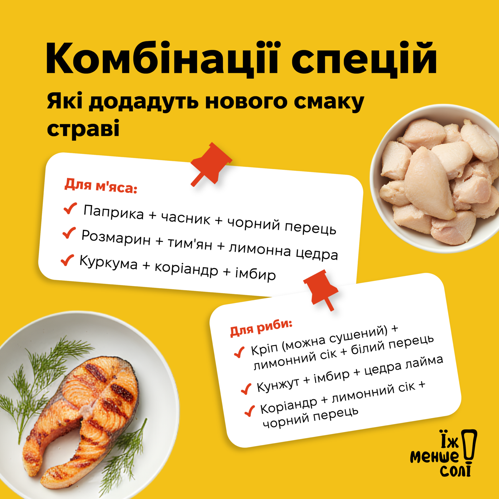 Під час приготування сіль можна замінити спеціями. Найкращі комбінації, які додадуть нового смаку страві: