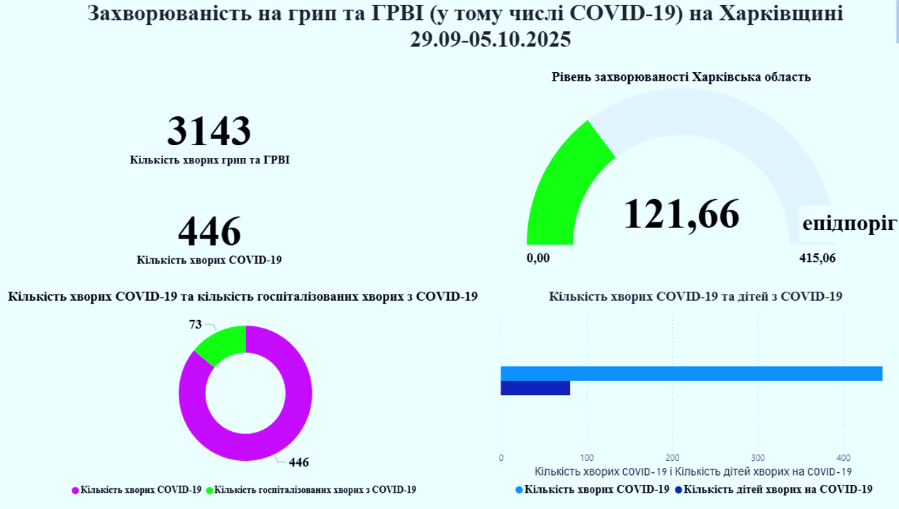 Розпочався новий епідемічний сезон. За результатами оперативного щотижневого аналізу захворюваності на гострі респіраторні вірусні інфекції (далі – ГРВІ) на першому тижні епідсезону (40 тиждень 2025 року – з 29.09.2025 по 05.10.2025) з урахуванням випадків захворювань на COVID-19 в області захворіло 3143 особи, з них 1263 (40,2%) – діти віком до 17 років. Показник захворюваності становить 121,66 на 100 тис. населення, що нижче показника епідемічного порогу на 70,7%. Інтенсивність епідемічного процесу відповідає низькому рівню. Госпіталізовано 137 осіб, з них 55 (40,1%) – дітей. Найвищий показник захворюваності зареєстровано у Берестинському районі – 291,54 на 100 тис. населення, найнижчий – у Куп’янському (23,68 на 100 тис. населення).