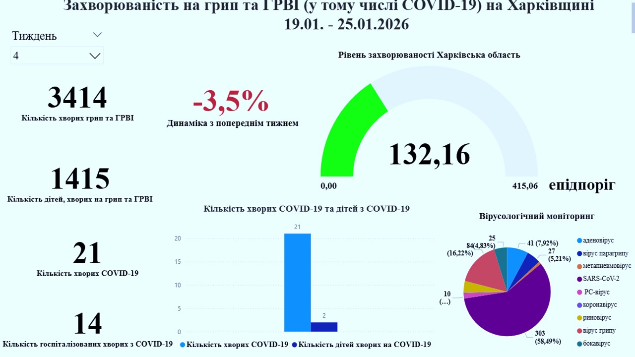 За результатами оперативного щотижневого аналізу на 4 тижні 2026 року (з 19.01.2026 по 25.01.2026) захворіло 3414 осіб, з них 1415 (41,4%) – діти віком до 17 років. Показник захворюваності становить 132,16 на 100 тис. населення, що нижче показника епідемічного порогу на 68,2%. Інтенсивність епідемічного процесу відповідає низькому рівню. У порівнянні з минулим тижнем захворюваність знизилась на 3,5%. Госпіталізовано 165 хворих, з них 47 (28,5%) дітей. Перевищення епідпорогу на 18,1% зареєстровано у Богодухівському районі, показник захворюваності 229,64 на 100 тис. населення. Інтенсивність епідпроцесу відповідає низькому рівню захворюваності.