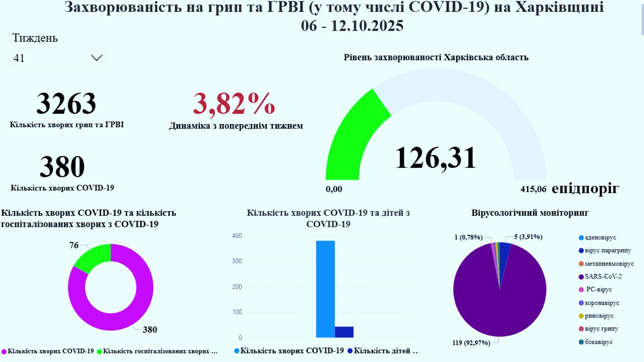 За результатами оперативного щотижневого аналізу захворюваності на гострі респіраторні вірусні інфекції (далі – ГРВІ) на 41 тижні 2025 року (06.10.2025 по 12.10.2025) з урахуванням випадків захворювань на COVID-19 в області захворіло 3263 особи, з них 1340 (41,1%) – діти віком до 17 років. Показник захворюваності становить 126,31 на 100 тис. населення, що нижче показника епідемічного порогу на 69,6%. Інтенсивність епідемічного процесу відповідає низькому рівню. Госпіталізовано 144 особи, з них 67 (46,5%) дітей. Перевищення епідпорогу на 7,6% зареєстровано у Берестинському районі, показник захворюваності – 292,5 на 100 тис. населення. Найнижчий показник захворюваності зареєстровано у Куп’янському районі (31,32 на 100 тис. населення).