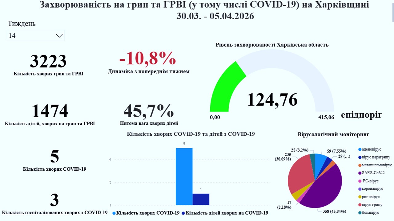 За результатами оперативного щотижневого аналізу на 14 тижні 2026 року (з 30.03.2026 по 05.04.2026) захворіло 3223 особи, з них 1474 (45,7%) дитини. Показник захворюваності становить 124,76 на 100 тис. населення, що нижче показника епідемічного порогу на 69,9%. Інтенсивність епідемічного процесу відповідає низькому рівню. У порівнянні з минулим тижнем захворюваність знизилась на 10,8%. У порівнянні з 14 тижнем 2025 року – нижче на 8,5%. Госпіталізовано 101 хворого з них 67 (66,3%) дитини. Перевищення епідпорогу не зареєстровано в жодному районі області.