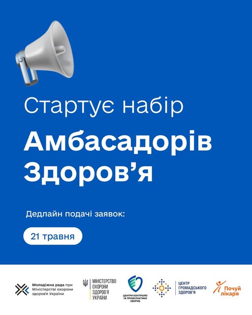 Молодіжна рада при МОЗ, спільно з Міністерством охорони здоровʼя, проєктом “Почуй лікаря”, Центрами контролю та профілактики хвороб (ЦКПХ), Центром громадського здоровʼя (ЦГЗ) запускає ініціативу «Амбасадори здоровʼя» — платформу для молоді, яка прагне впливати на здоровʼя нації, просувати культуру профілактики захворювань, здорового способу життя та підвищувати рівень медичної грамотності у своїх громадах.