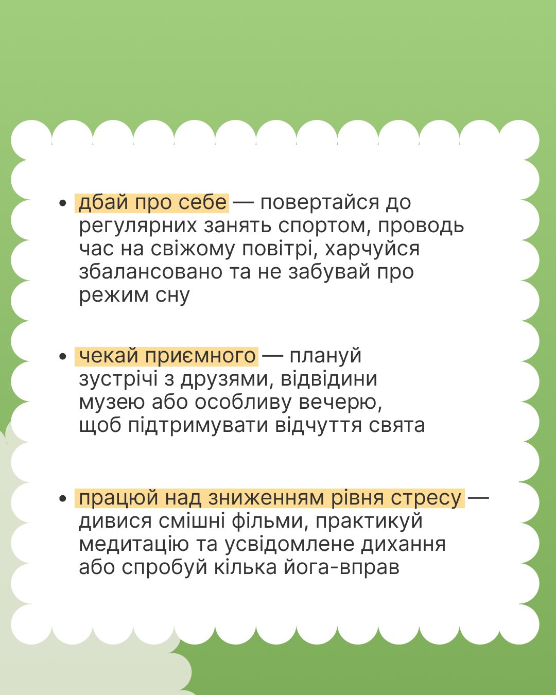 Тож не картай себе за погіршення настрою, підвищений рівень тривоги чи виснаження. Краще потурбуйся про себе. Дізнайся як — у каруселі