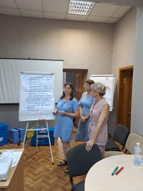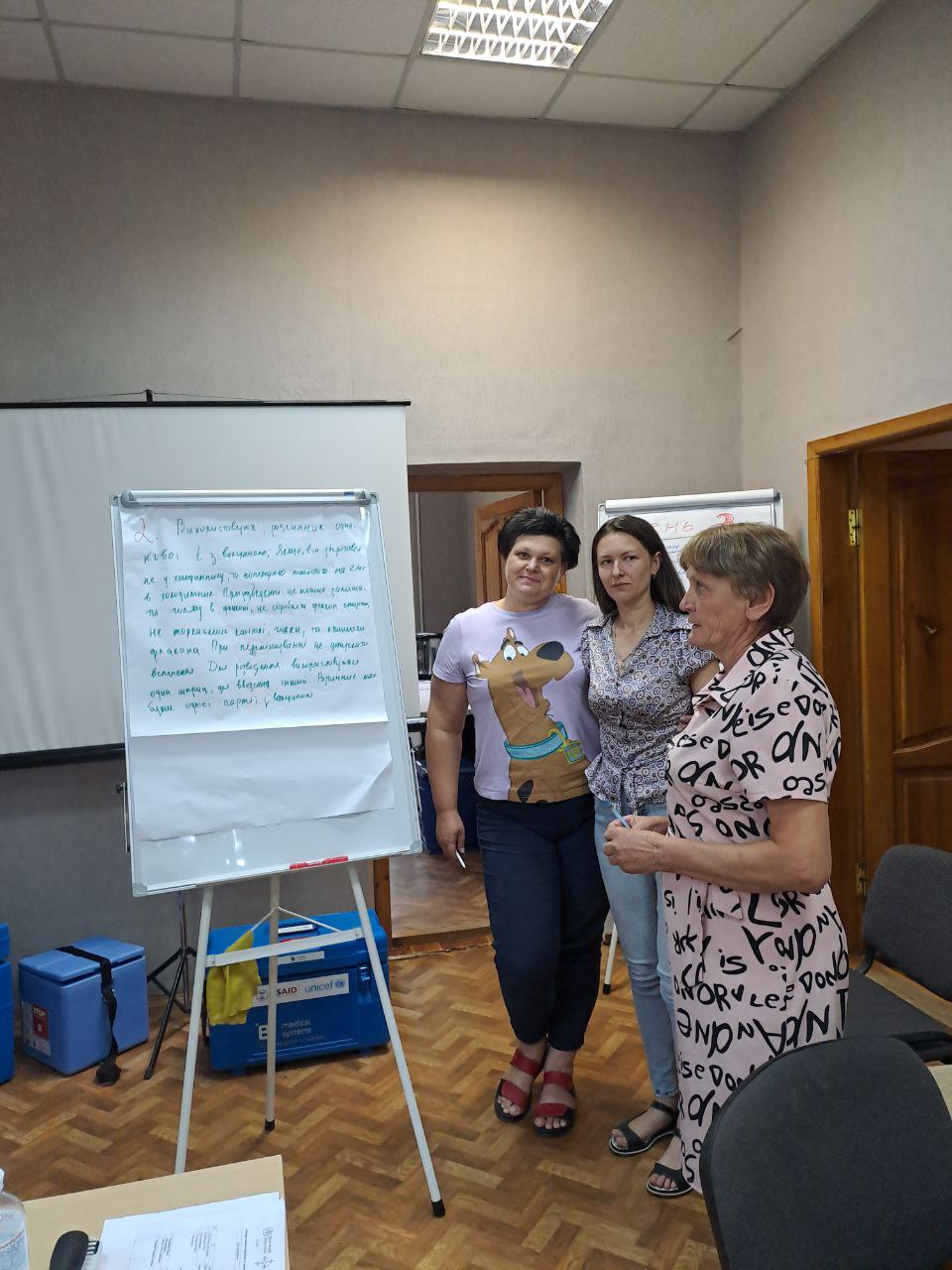 На тренінгу обговорювали принципи комунікації з громадами, правила ефективної комунікації з батьками та опікунами дітей до, під час та після сесії вакцинації. Під час практичних занять учасники моделювали ситуації, які трапляються в повсякденній роботі, відпрацьовували навички з питань управління вакцинами та дотримання вимог «холодового» ланцюга, моніторингу за наданням послуг з імунізації, проведення сесій вакцинації, безпеки ін’єкцій.