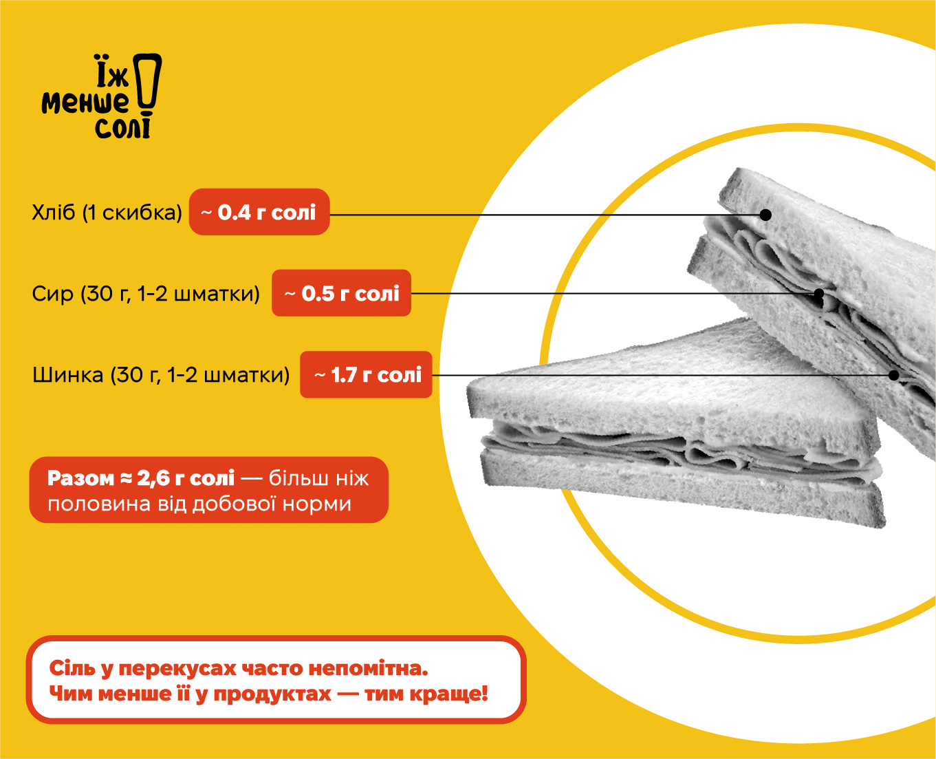 🍞Чи знаєш ти, що в одній скибці улюбленого хліба — 0,4 г солі? А в одному бургері середнього розміру — понад половина денної норми солі (більш ніж пів чайної ложки, або ж 2,64 г)?