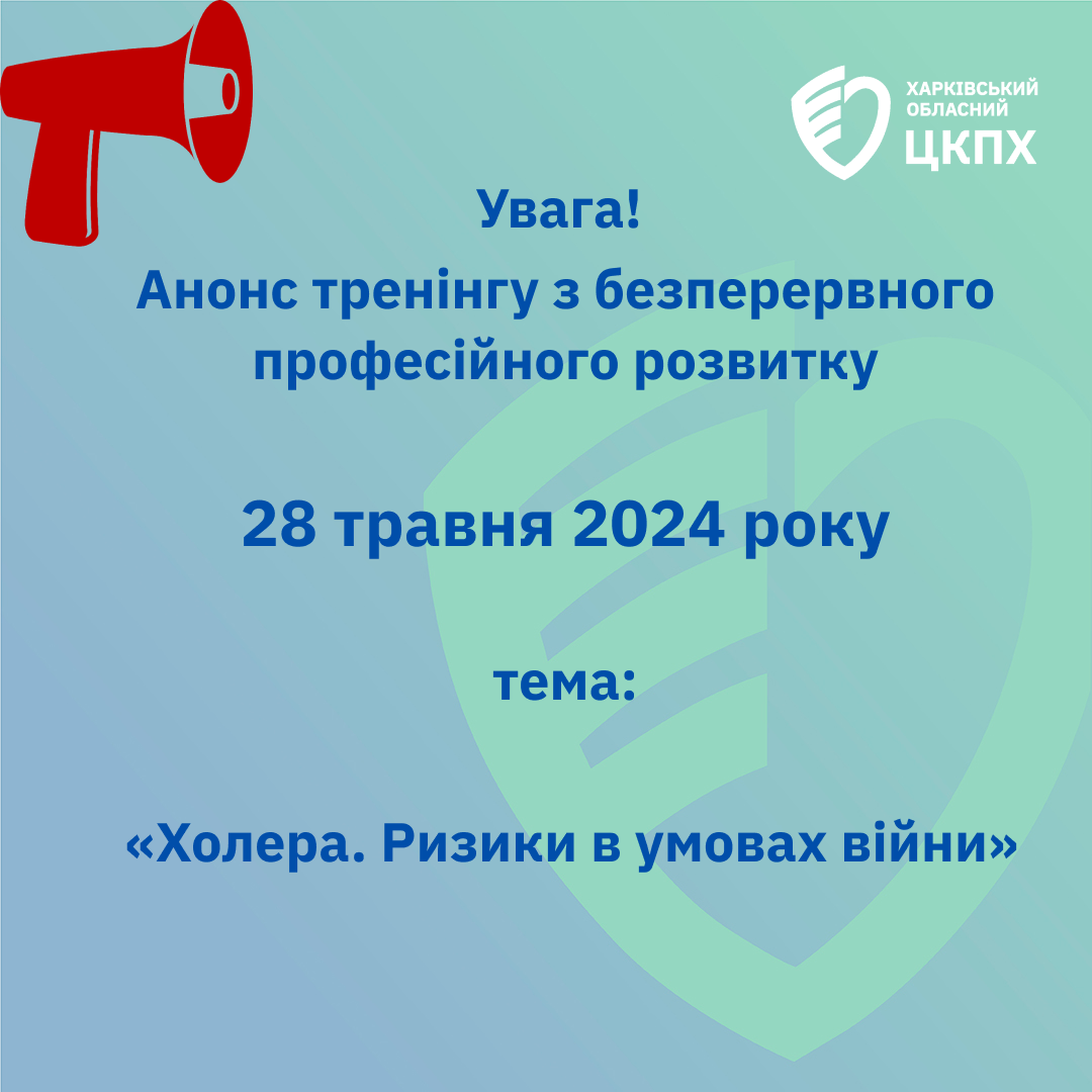 Повідомляємо, що 28 травня 2024 року о 10.00 год. на базі Харківського обласного центру контролю та профілактики хвороб за адресою: м. Харків, Помірки, відбудеться тренінг на тему «Холера. Ризики в умовах війни».