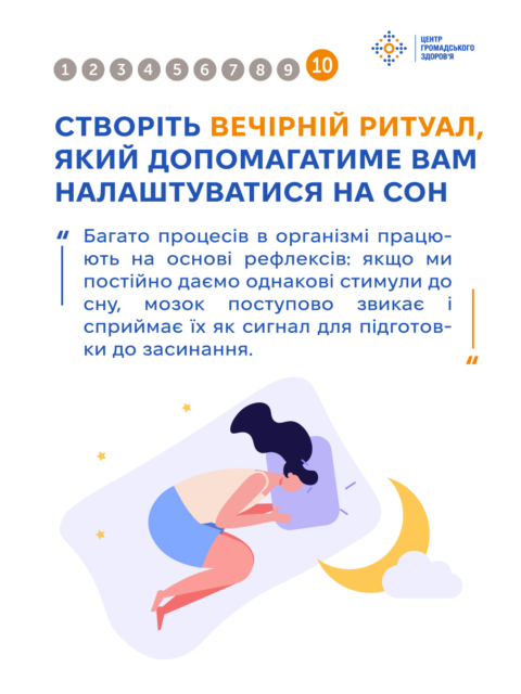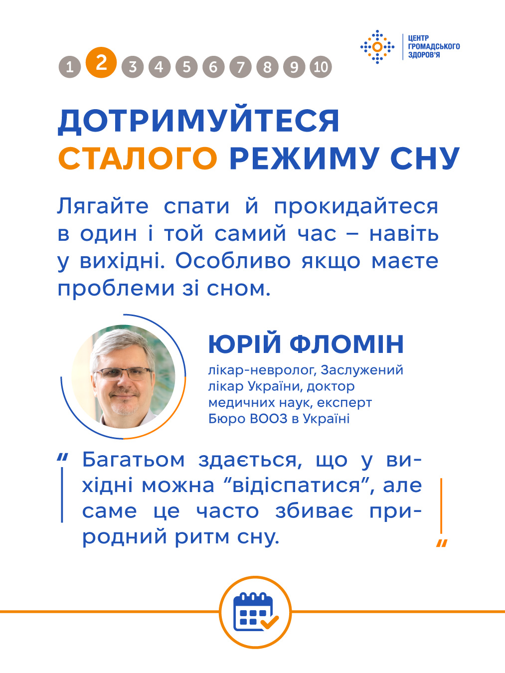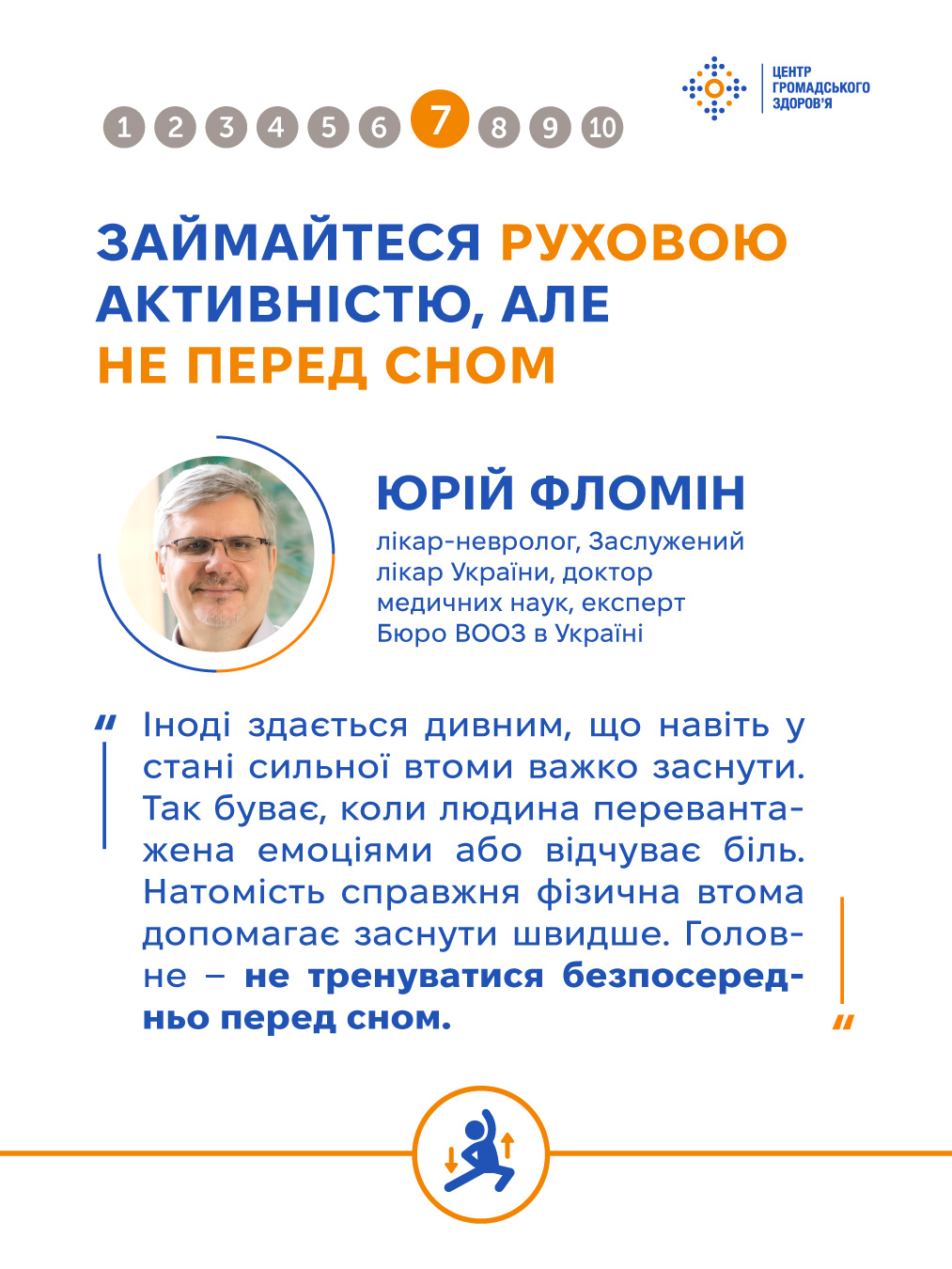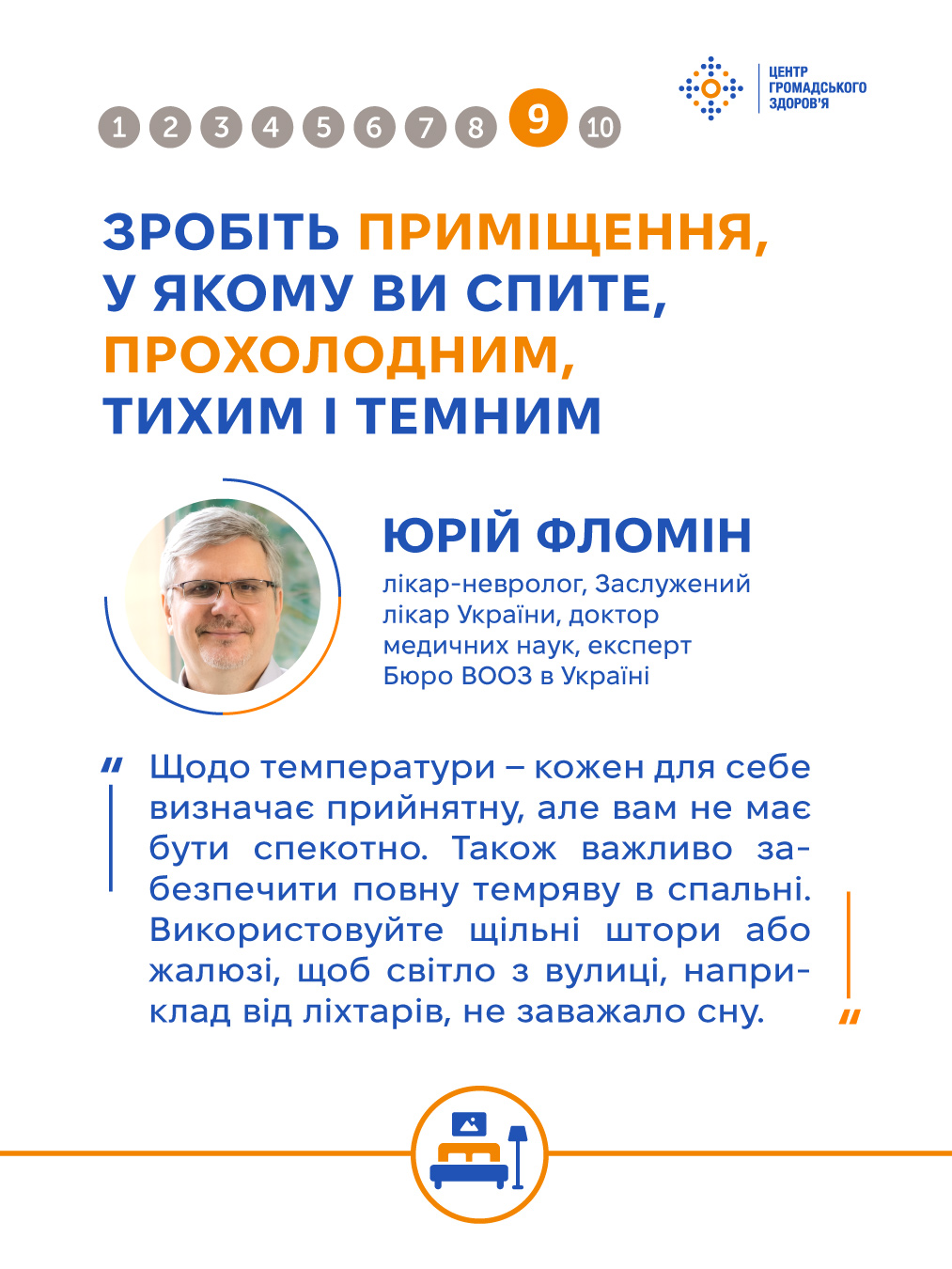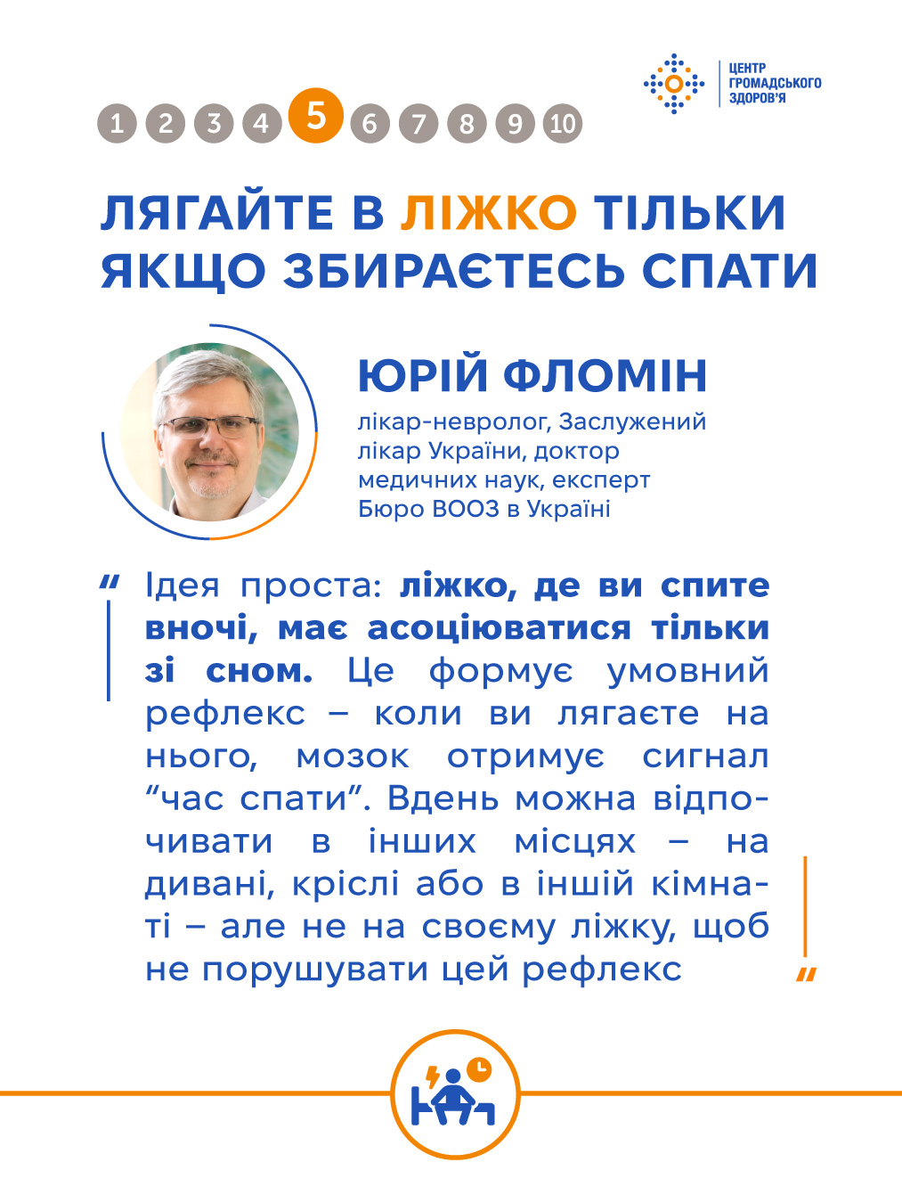 📝 У матеріалі, підготовленому Центром громадського здоров’я спільно з доктором Фломіним, лікар ділиться порадами, як покращити сон завдяки формуванню корисних звичок і відмові від шкідливих.
