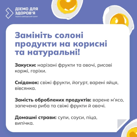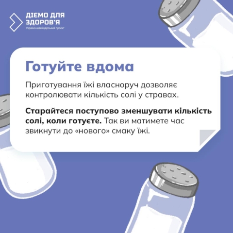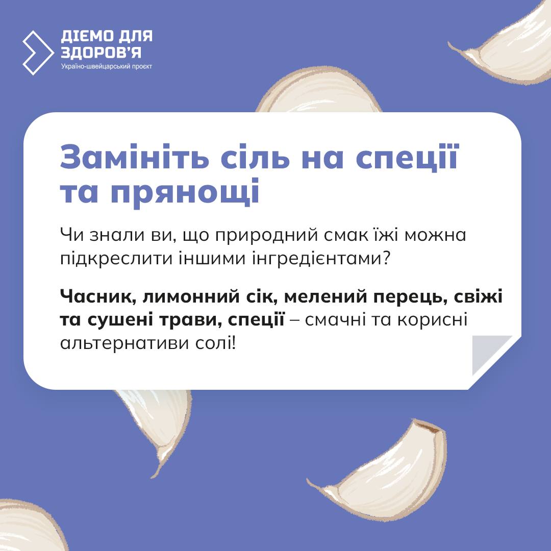 Переглядайте на картках прості способи, які дозволять зменшити кількість солі у вашому раціоні, аби організм працював без зайвого навантаження