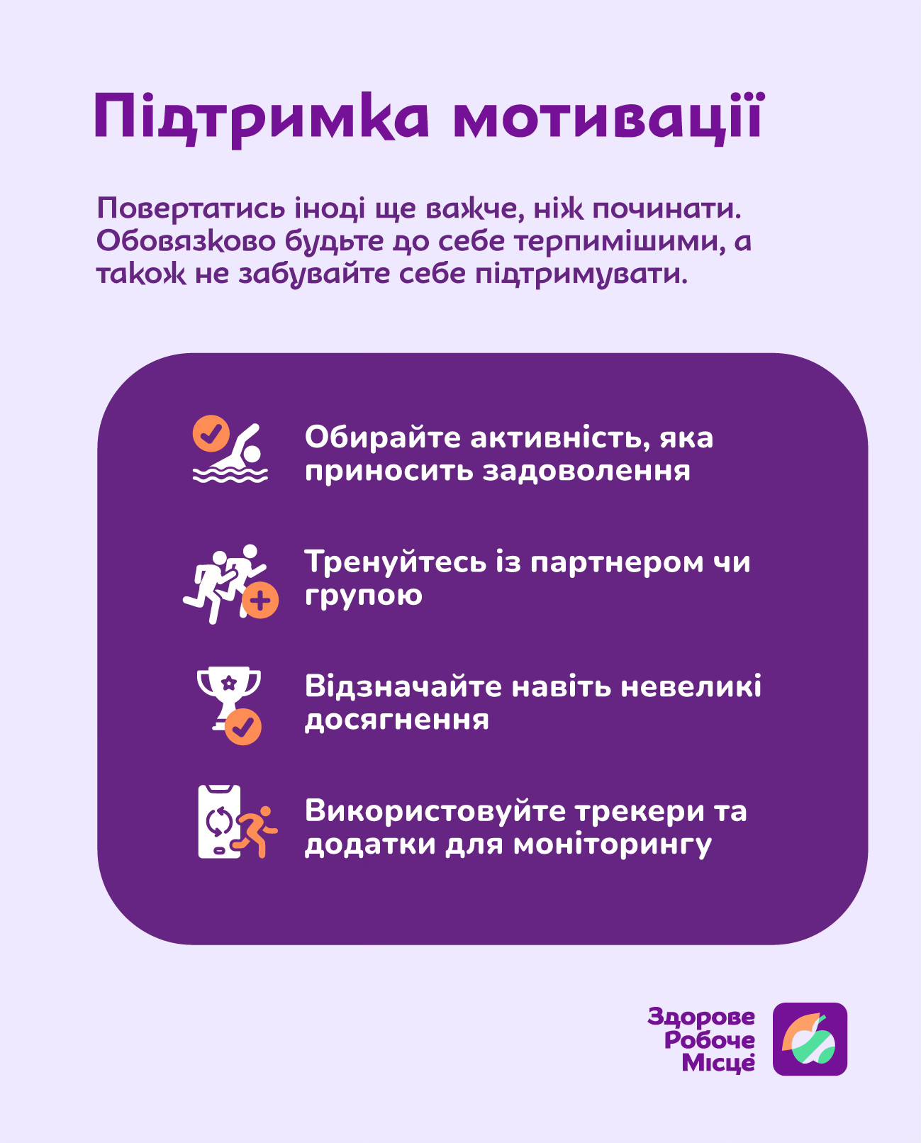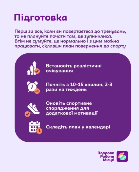 На картках зібрали рекомендації, які допоможуть плавно та впевнено відновити вашу спортивну рутину.