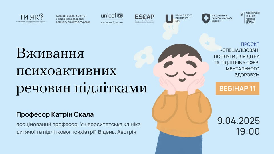 Запрошуємо до участі у вебінарі «Вживання психоактивних речовин підлітками», що відбудеться онлайн 9 квітня 2025 року о 19:00 за київським часом.