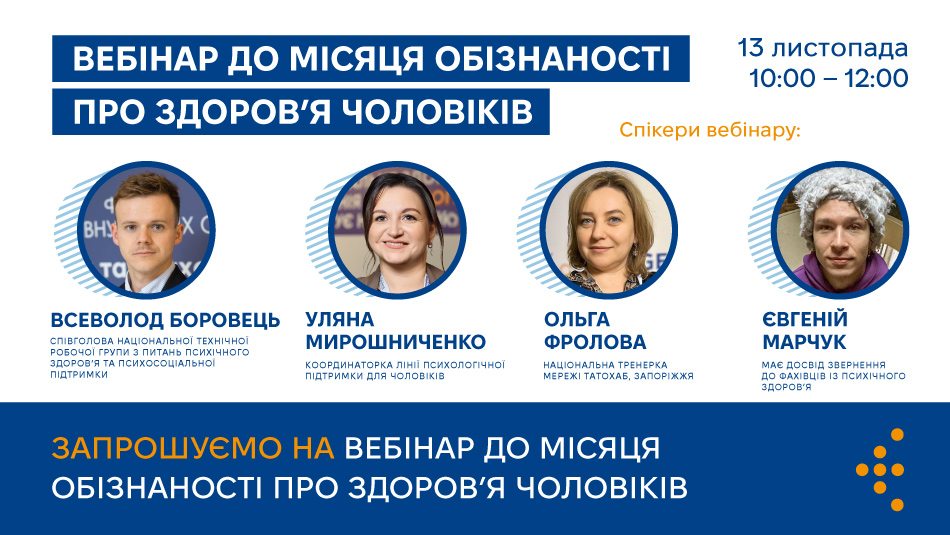 Учасники вебінару ознайомляться з результатами та досягненнями кампанії «Будь другом. Собі теж», обговорять ефективні інтервенції та успішні програми ТатоХаб та Лінія психологічної підтримки для чоловіків, що реалізуються за підтримки UNFPA (Фонд ООН в галузі народонаселення), а також дізнаються про особистий досвід чоловіків та практичні кроки, які допомагають підтримувати чоловіче здоров’я і долати виклики, що постають перед ними.